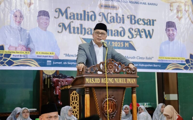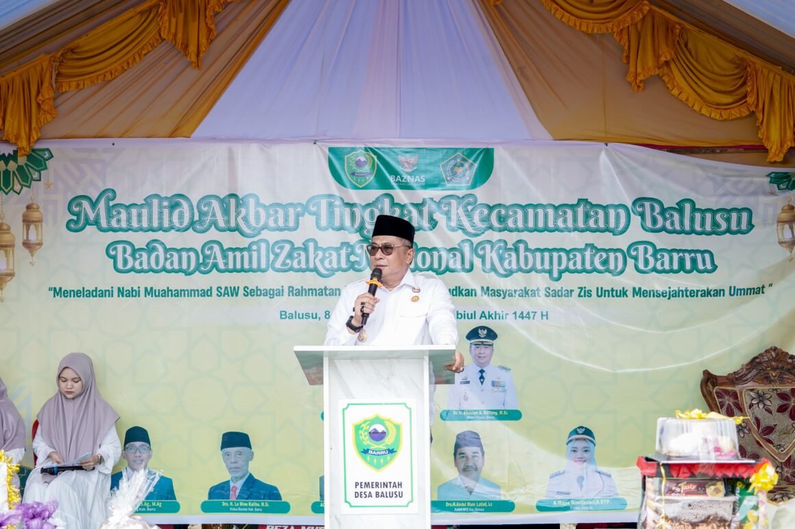 Barru, Petta – Wakil Bupati Barru, Dr. Ir. Abustan A. Bintang, M.Si., menghadiri Peringatan Maulid AkbarTingkat Kecamatan Balusu yang diselenggarakan oleh Badan Amil Zakat Nasional (BAZNAS) Kabupaten Barru, di Lapangan Depan Kantor Desa Balusu, Kecamatan Balusu, Rabu (8/10/2025).