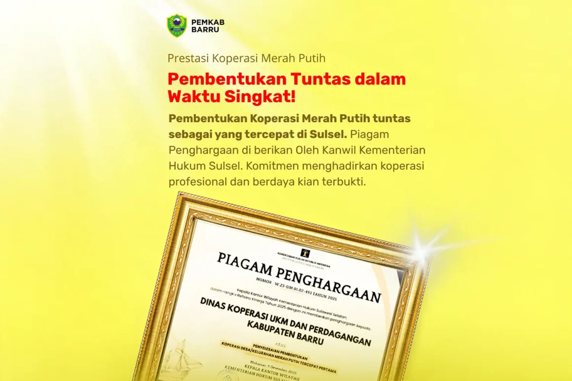 Keberhasilan ini mendapat apresiasi dari Kantor Wilayah Kementerian Hukum dan HAM (Kanwil Kemenkumham) Sulawesi Selatan. Piagam Penghargaan diserahkan kepada Pemkab Barru melalui Dinas Koperasi UKM dan Perdagangan pada acara Peringatan Hari Anti Korupsi Sedunia di Makassar, Selasa (9/12/2025).