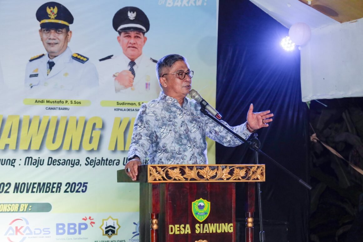 Barru, Petta – Wakil Bupati Barru, Dr. Ir. Abustan A. Bintang, M.Si., menghadiri puncak peringatan Hari Ulang Tahun (HUT) ke-33 Desa Siawung, di halaman Kantor Desa Siawung, Kecamatan Barru, Minggu (2/11/2025) malam.