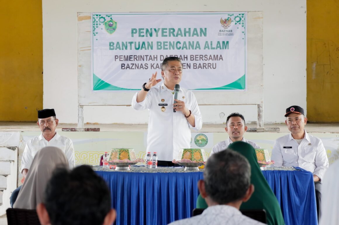 Barru, Petta – Pemerintah Kabupaten Barru bersama Badan Amil Zakat Nasional (BAZNAS) Kabupaten Barru menyalurkan bantuan kepada warga terdampak bencana alam angin puting beliung di Baruga Colliq Pujie, Desa Pancana, Kecamatan Tanete Rilau, Rabu pagi (25/12/2025).